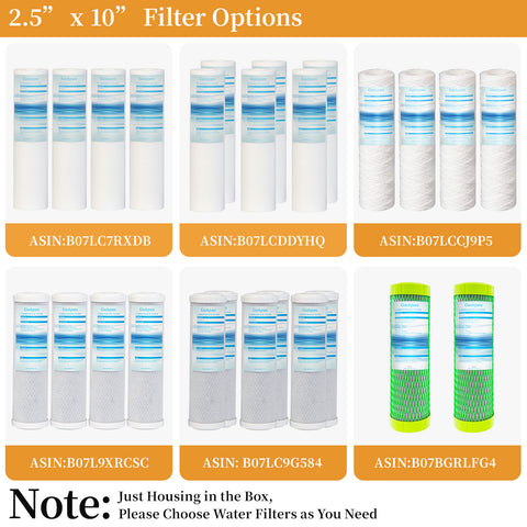 STANDARD-Fits standard sized 2.5 inch x 10 inch filters . Housing only, filter cartridges are sold separately.ASIN for matched filter cartridges options: B07LC7RXDB | B07LCDDYHQ | B07LCCJ9P5 | B07L9XRCSC | B07LC9G584 | B07BGRLFG4