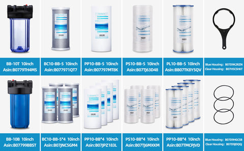 1.PP spun filter,ASIN:B07797MT8K, Remove sand, dirt, sediment. life time:6 months. 2.Carbon block filter, ASIN:B077971QT7,Further remove chlorine, taste & odors, very fine particulates. life time:6 months. PS.The Life Time of the Filter Cartridge Depends on Usage Amount and Feed Water Quality.