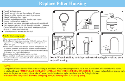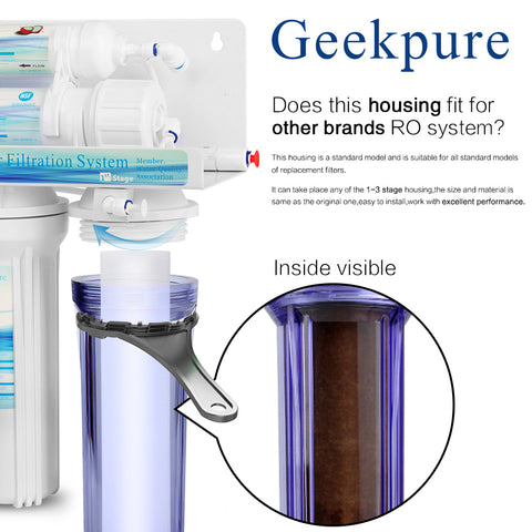 10 Inch filter housing for Geekpure Reverse Osmosis RO system,Widely used in standrd size RO system or pre-filtration.It is not universal compatible filter housing,Different brand,thread part is different. Alternatively, you may obtain a replacement sump from your original brand if you don't want to re-install