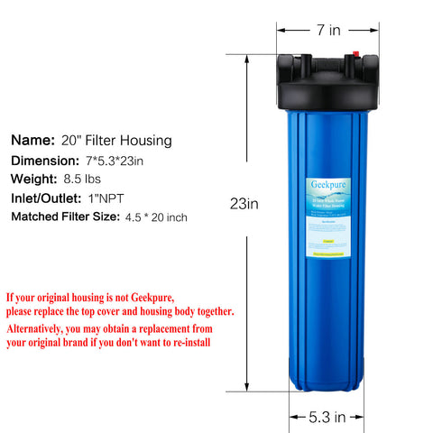 - STANDARD-Fits all standard sized 4-1/2 inch diameter industry 20 inch whole house cartridges