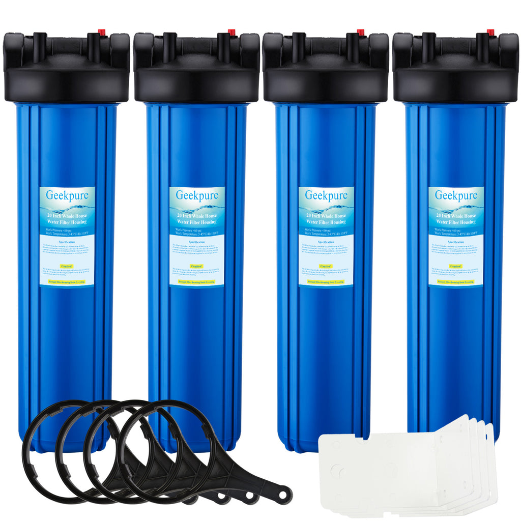 - Pack of 4 Sets 20 inch Jumbo blue housing,1"NPT inlet/outlet,with pressure release button for high flow,plastic wrench and metal bracket.Housing only, filter cartridges are sold separately