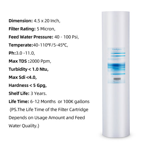 - LIFE TIME:6-12 months or 100K gallons water.Flow rate : 5-15 GPM (Depend on Feed Water Pressure), 1 Year warranty.Note:this system will NOT reduce Total Dissolved Solids (TDS),but keeps healthy minerals in your water. If you are searching for a filter that removes TDS, Please refer Geekpure Reverse Osmosis systems